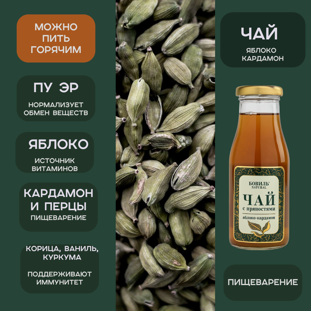 Состав: вода очищенная, чай Пу Эр, сухофрукты (яблоко сушеное), пряности (кардамон, белый перец, черный перец, корица, ваниль стручковая, куркума), свежий апельсин, сахарный сироп.Объем: 0,25;