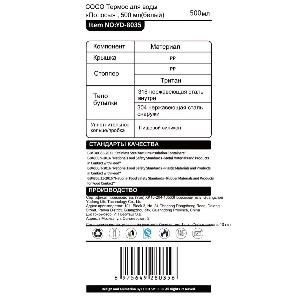 - Внутренний контур бутыли выполнен из высококачественной нержавеющей стали 316, безопасной для здоровья . Такая нержавеющая сталь устойчива к воздействию высоких температур и кислот и сохранит ваш напиток с заботой о здоровье.