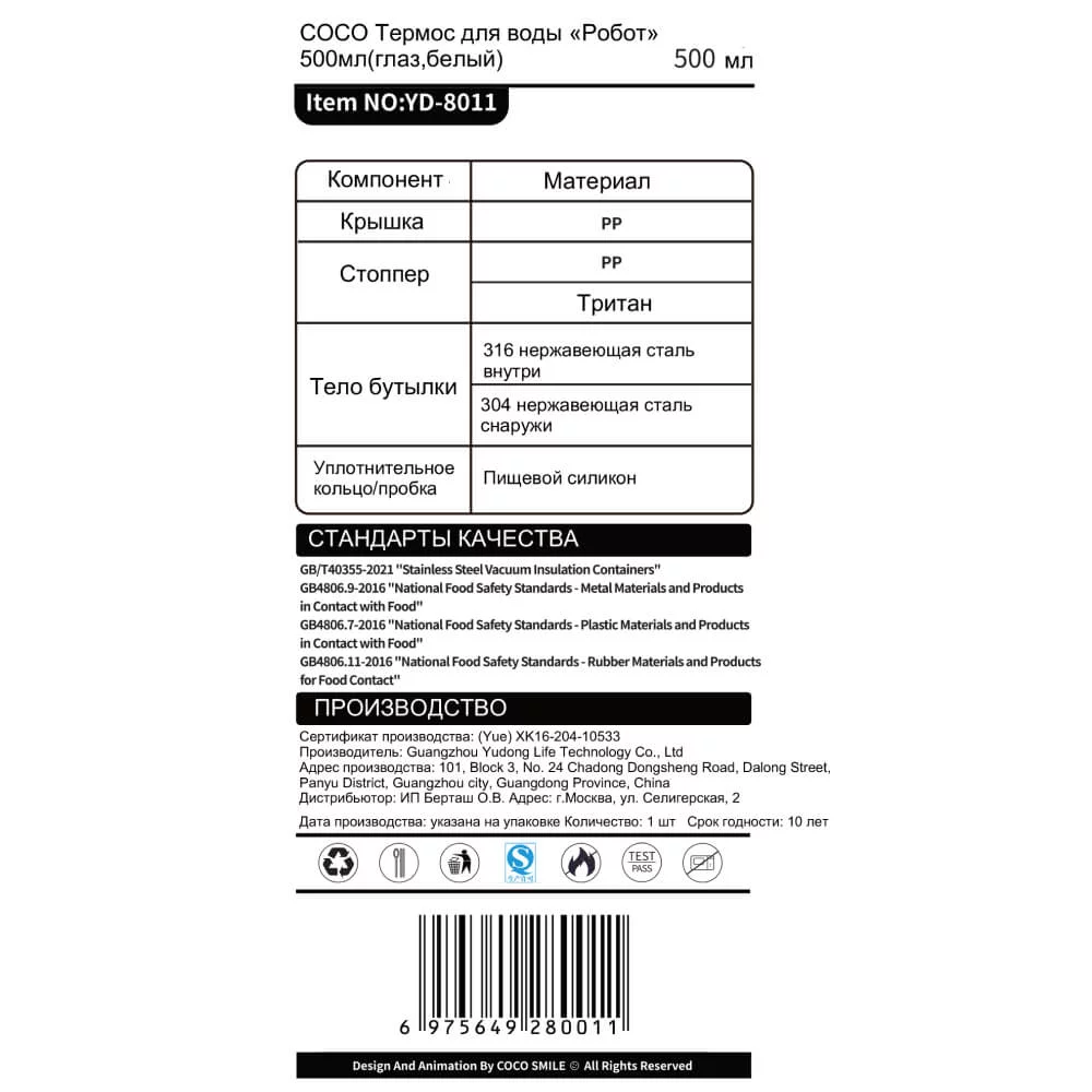 COCO Термос для воды «Робот» 500мл (глаз, белый)