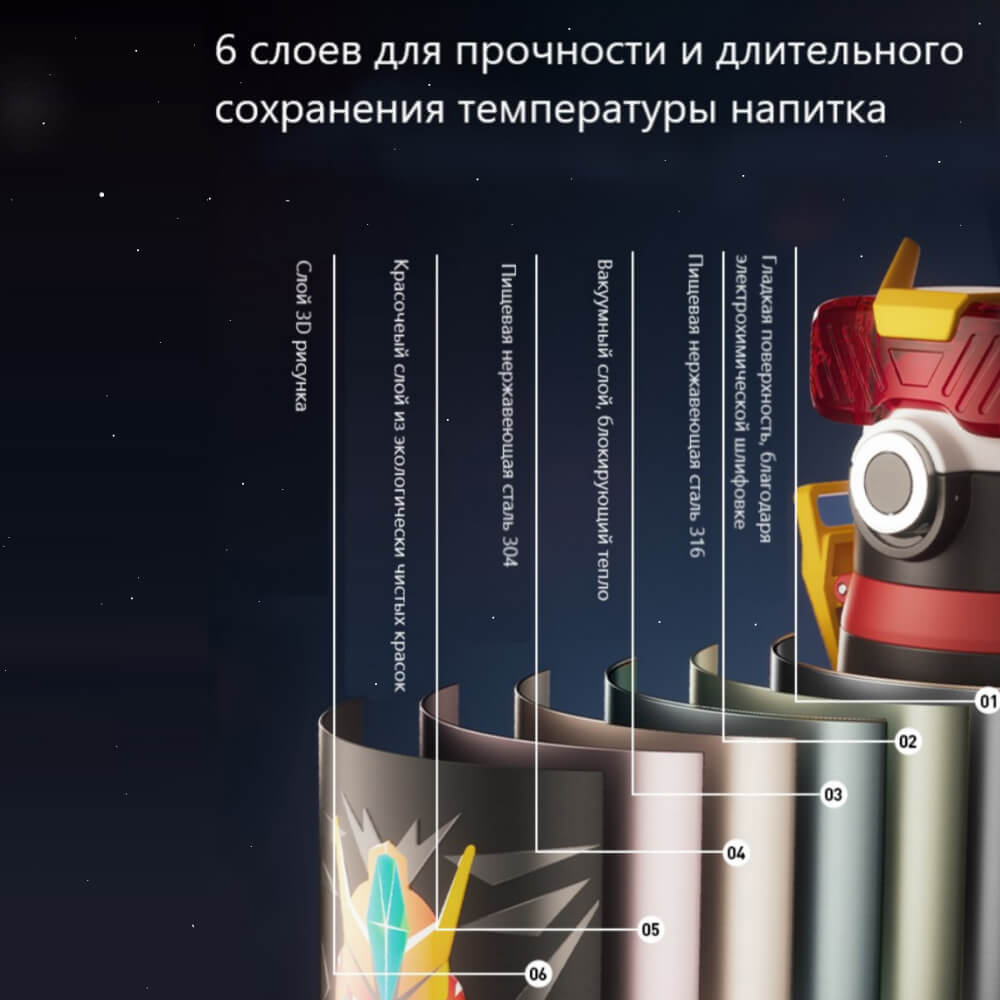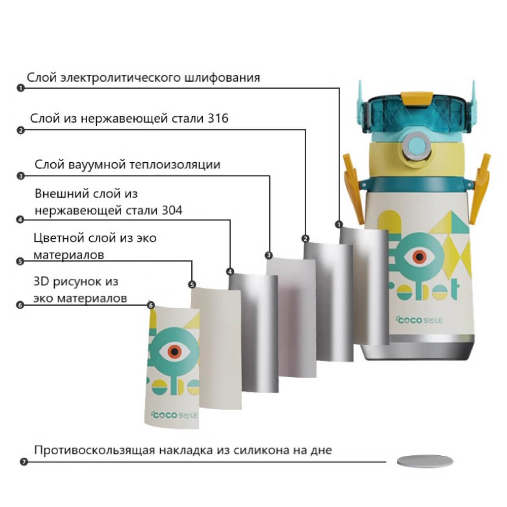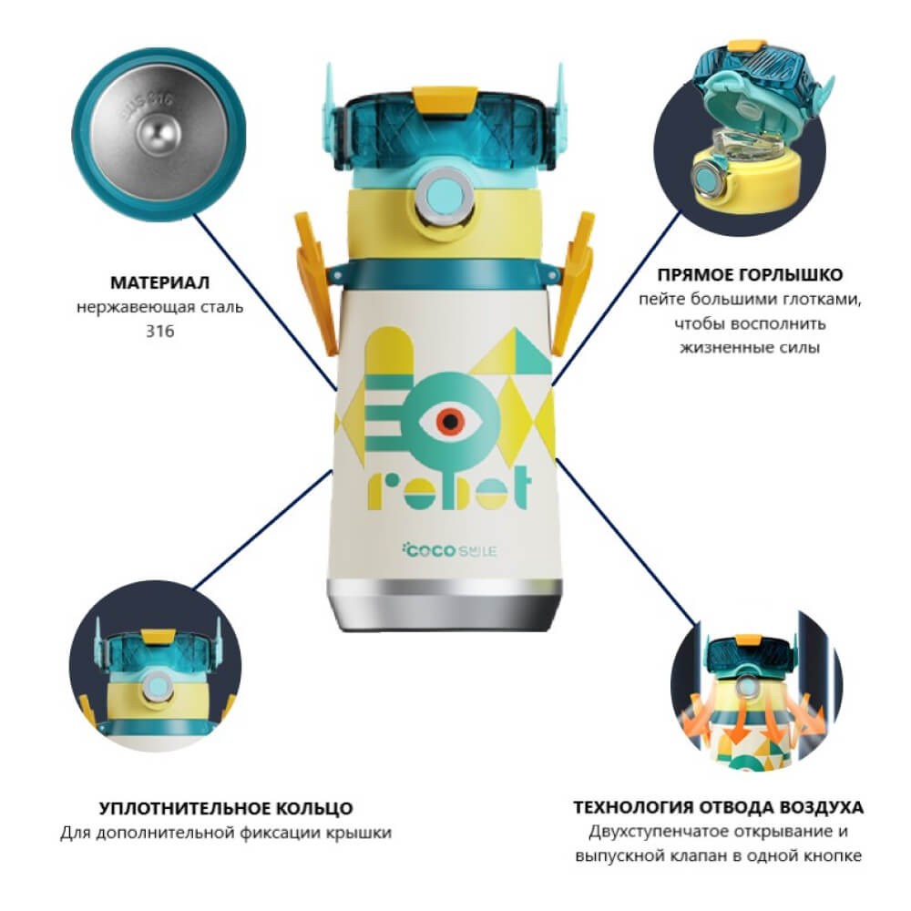 Яркий и необычный термос в форме робота держит температуру напитка до 6 часов. Его так удобно брать с собой, благодаря стильному ремешку в комплекте. Со стильным термосом от Coco Smile вы всегда будете в центре внимания. 3D рисунок на корпусе устойчив к воздействиям.