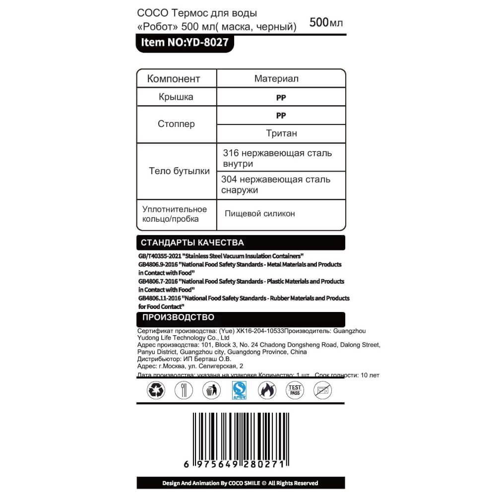 COCO Термос для воды «Робот» 500мл (маска, чёрный)