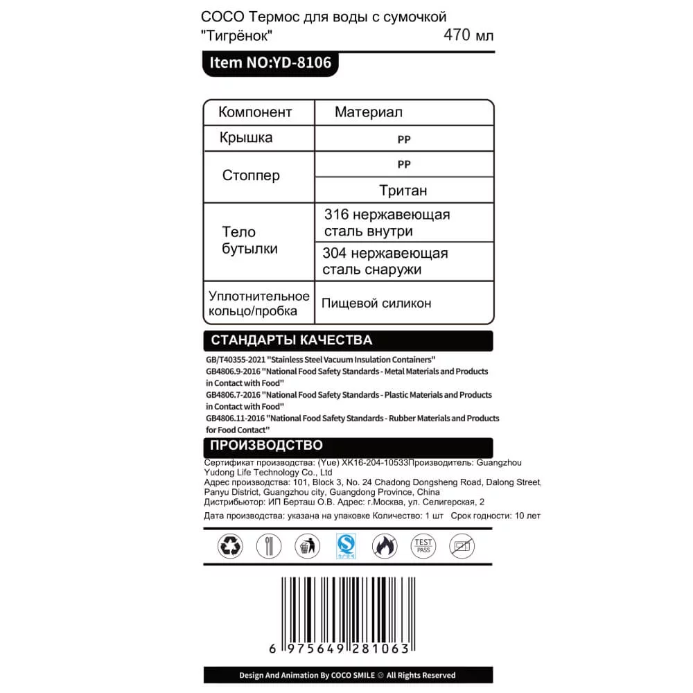 COCO Термос для воды с сумочкой «Тигрёнок» 470мл (красный)