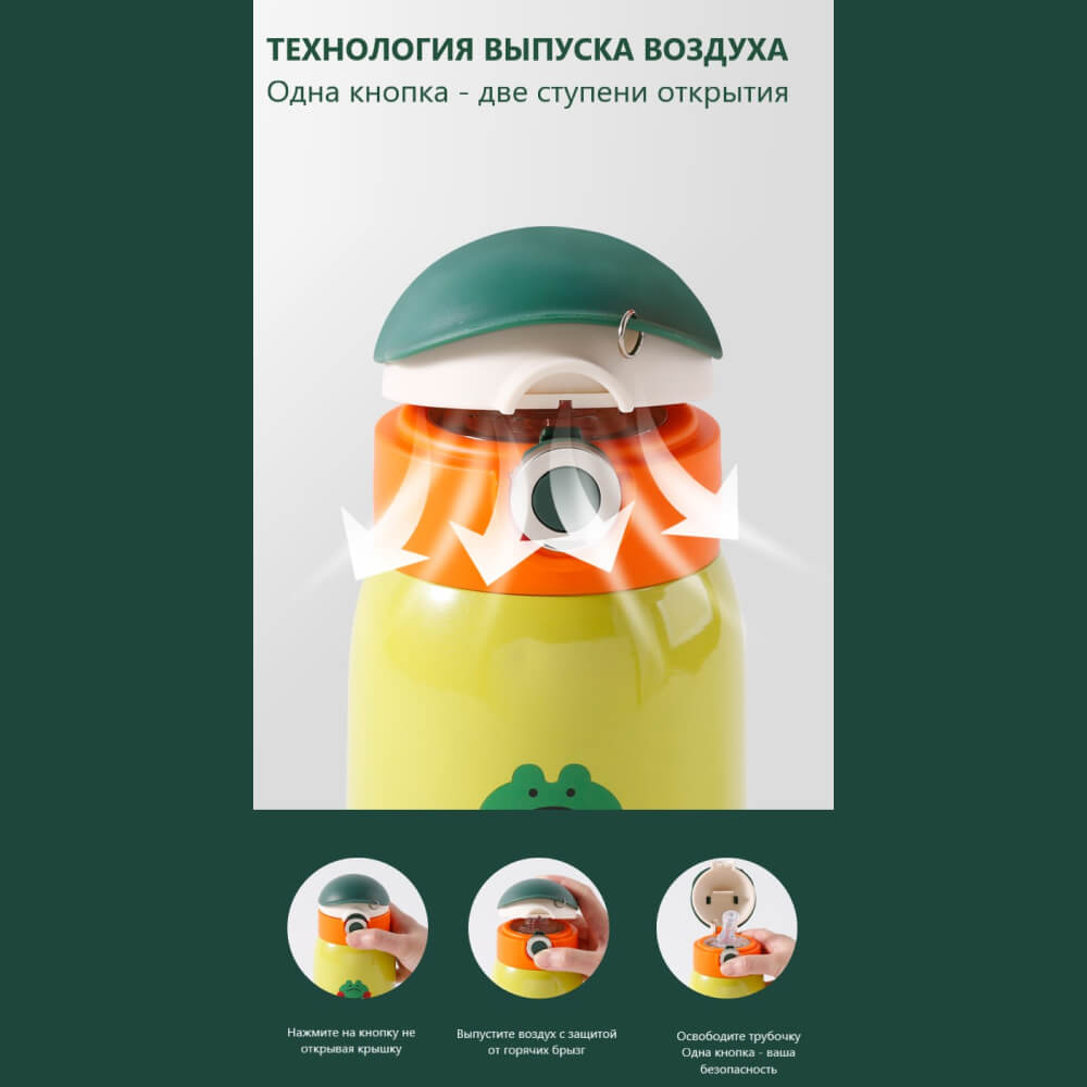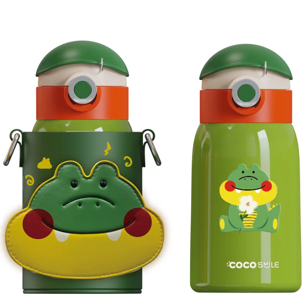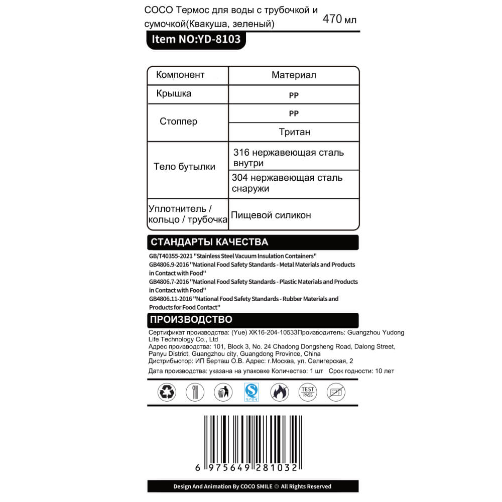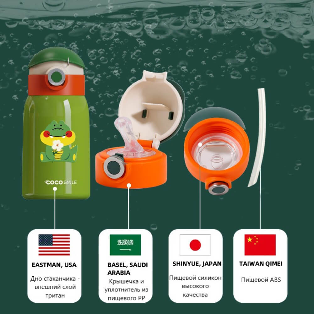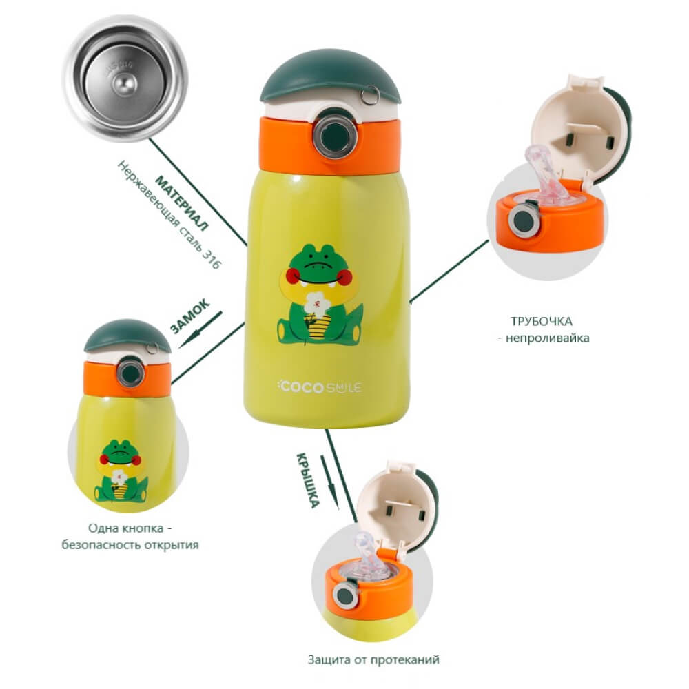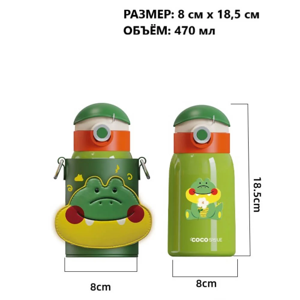 COCO Термос для воды с трубочкой и сумочкой 470мл (Квакуша, зелёный)